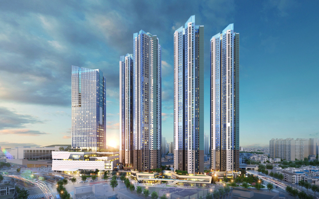 - 아파트 4개동 총 1,425세대 중 일반분양 1,263세대 및 부대복리시설. B7F~65F