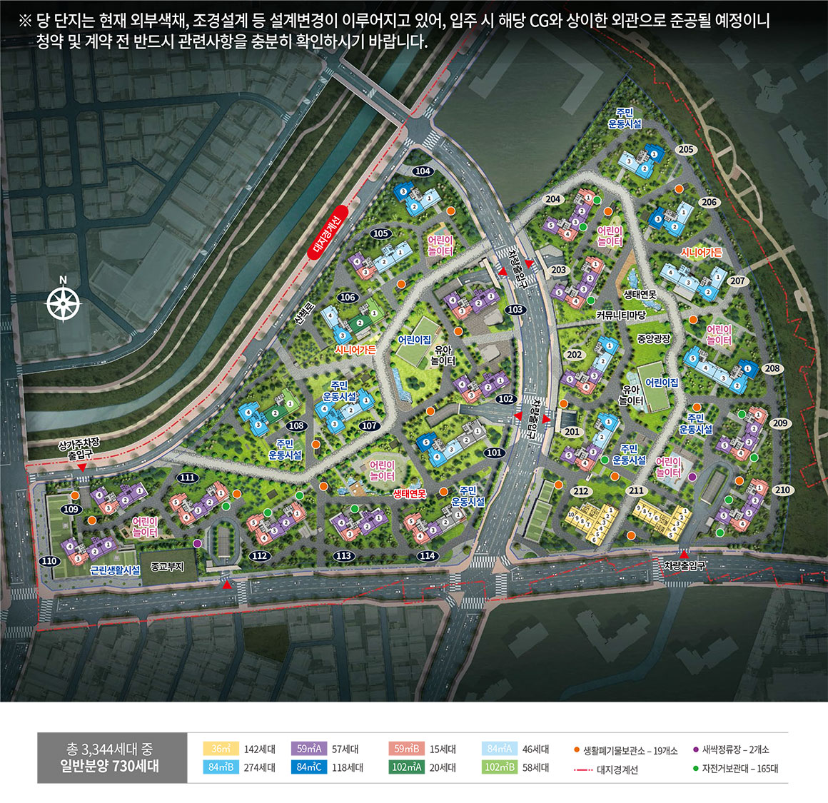 ※ 상기 배치도는 소비자의 이해를 돕기 위한 것으로 실제와 차이가 있을 수 있으며, 건축물의 외관 및 색채ㆍ창호ㆍ조경 계획, 문주 등은 일부 변경될 수 있습니다.